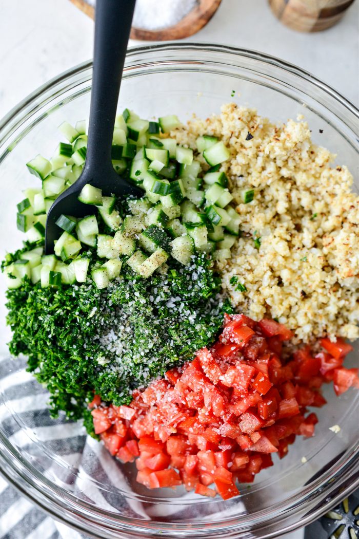 - In a large bowl, add roasted cauliflower rice, minced parsley mixture, diced tomatoes and cucumber. Squeeze in lemon juice, add olive oil and season with kosher salt and freshly ground black pepper to taste.