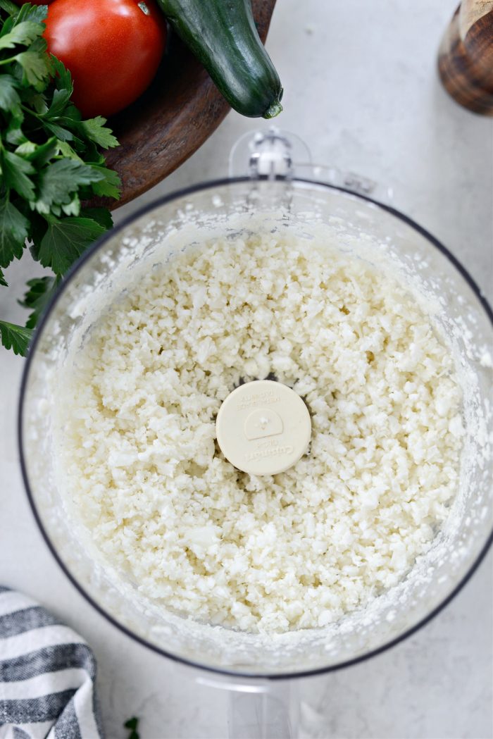 Meanwhile, break down the head of cauliflower into florets. Try to keep them similar in size – not too large and not too small. In the bowl of your food processor, fitted with the blade attachment, work in batches adding pulsing until the cauliflower resembles rice.
