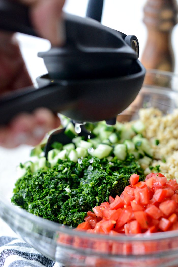 In a large mixing bowl, add the cooled, roasted cauliflower rice, parsley mixture, 2 small Romas that were seeded and diced small and 1/2 an English cucumber, seeded and diced small.
