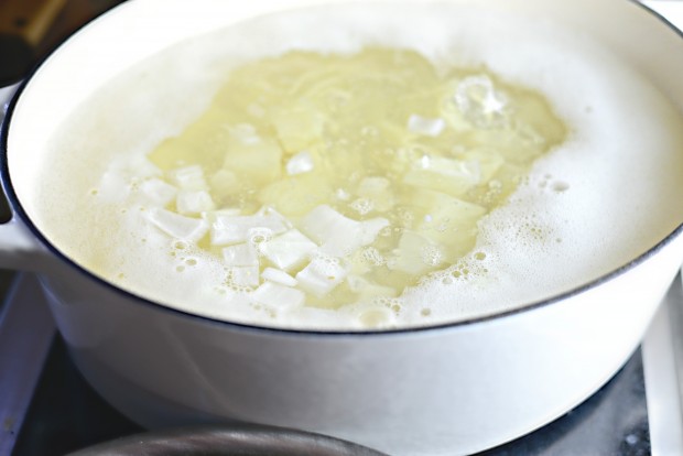 When the potatoes are just about fork tender and at 15 minute mark, add the onions in with the potatoes. THIS is where I fell in love. You add the onion TO the pot where THEY will soften!!! No second pan needed. It’s so simple, yet I’m amazed.