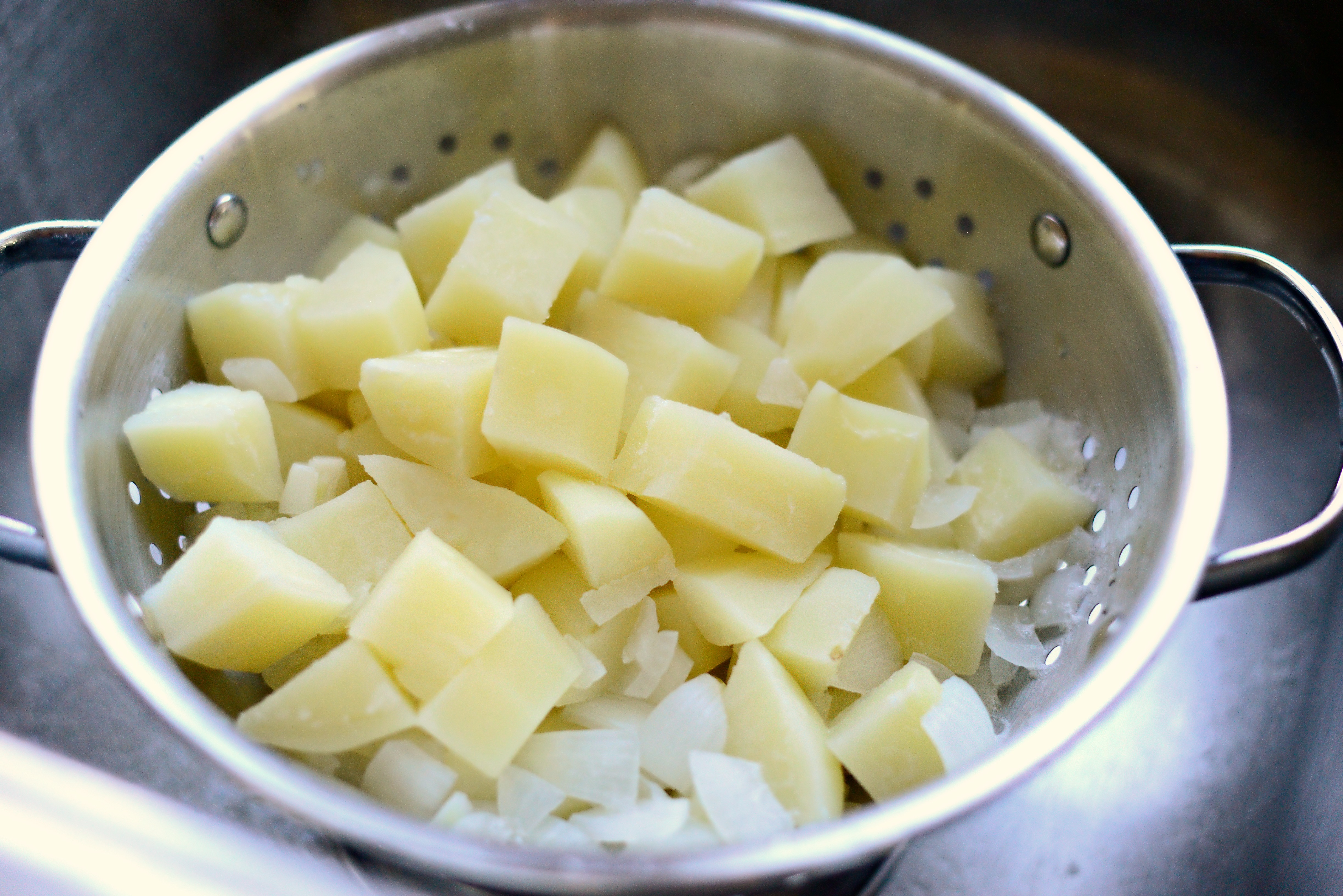 - 3 medi medium russet potatoes, peeled, rinsed and cubed
