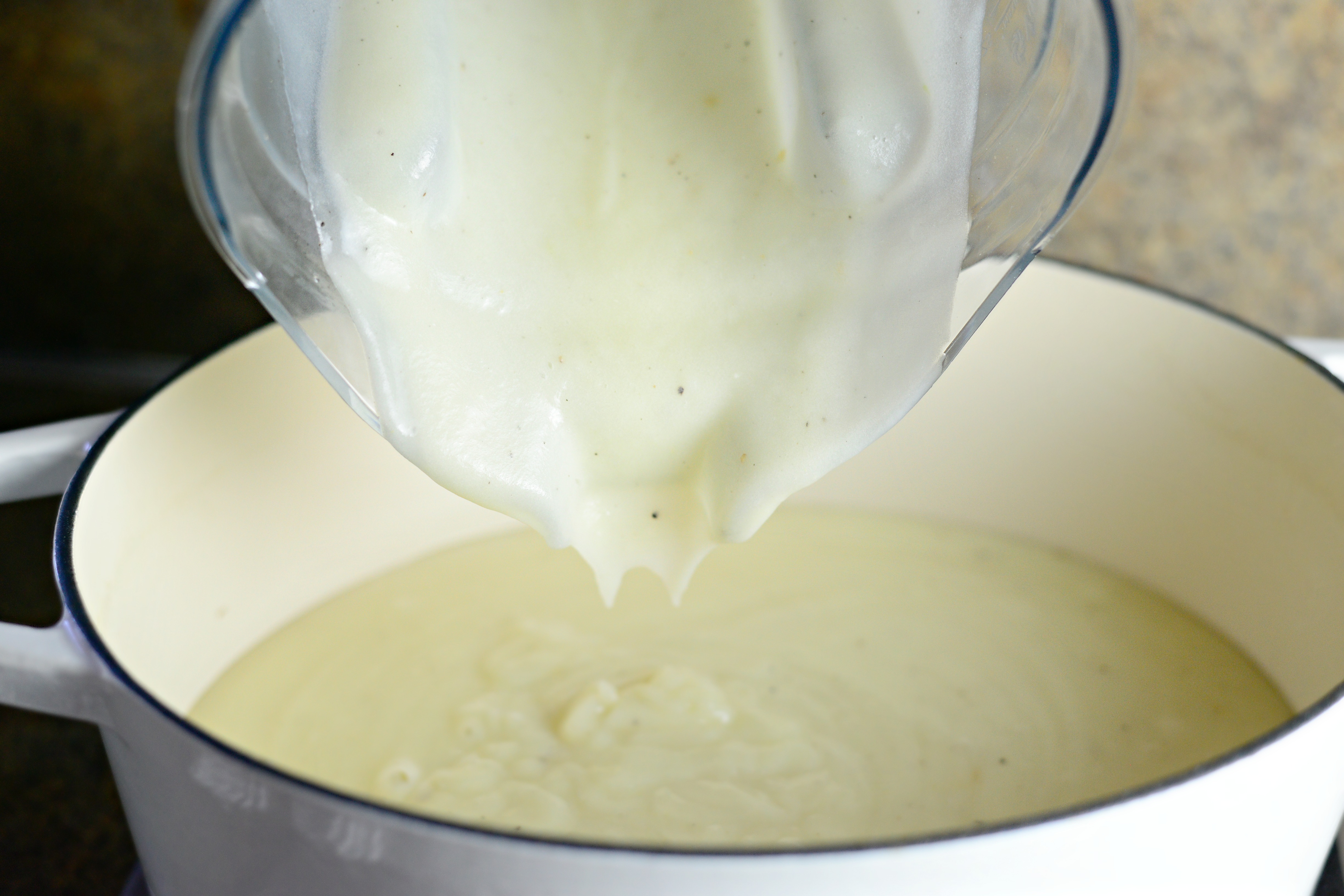 I transferred the pureed roasted garlic potato soup back into the pot to keep warm.