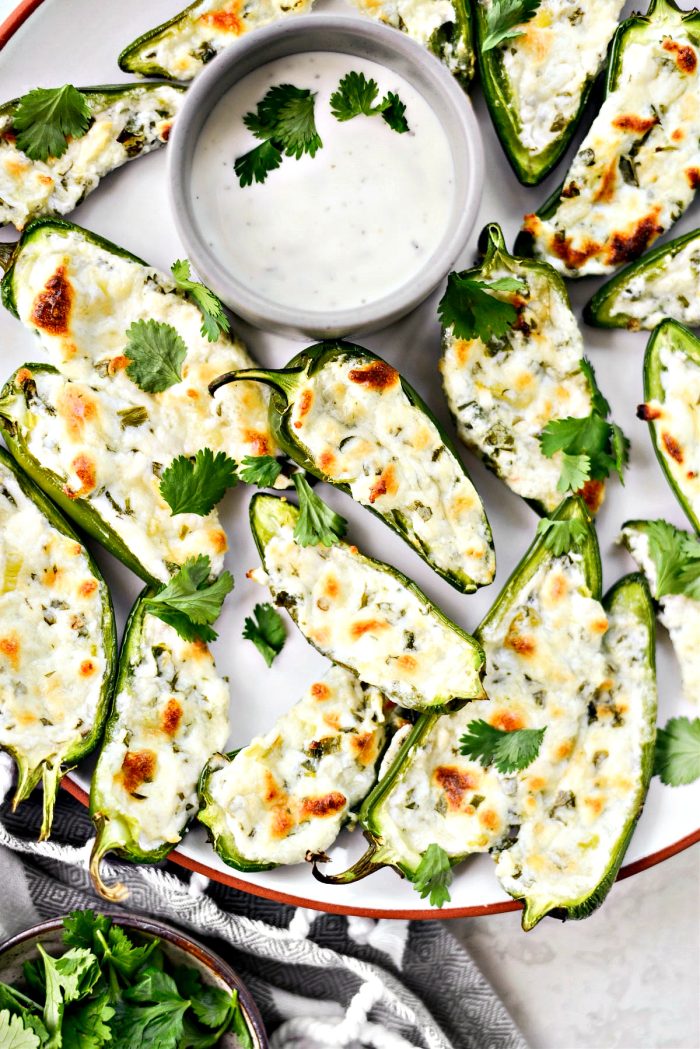 Before you let loose and start inhaling these roasted jalapeño poppers, transfer them to a platter with a little dish of ranch dressing for dipping, and sprinkle it all with fresh cilantro leaves. Dipping in the ranch helps diffuse the heat a little. But only a little. Because these babes are spicy!