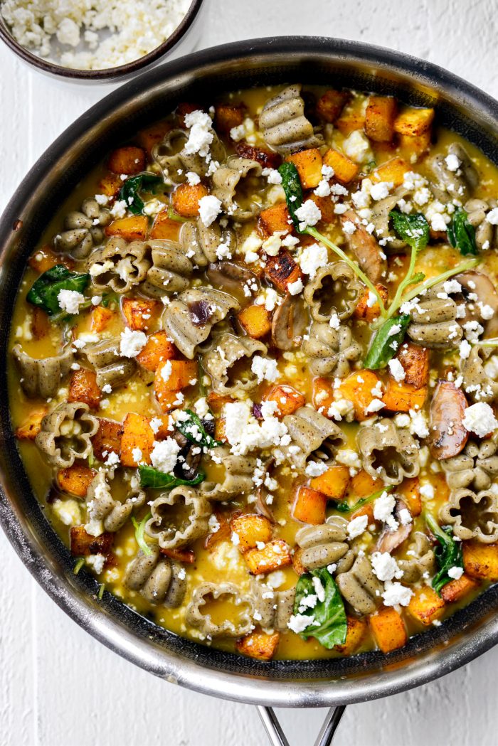 To the skillet, add the roasted pumpkin and leftover cooked pasta.