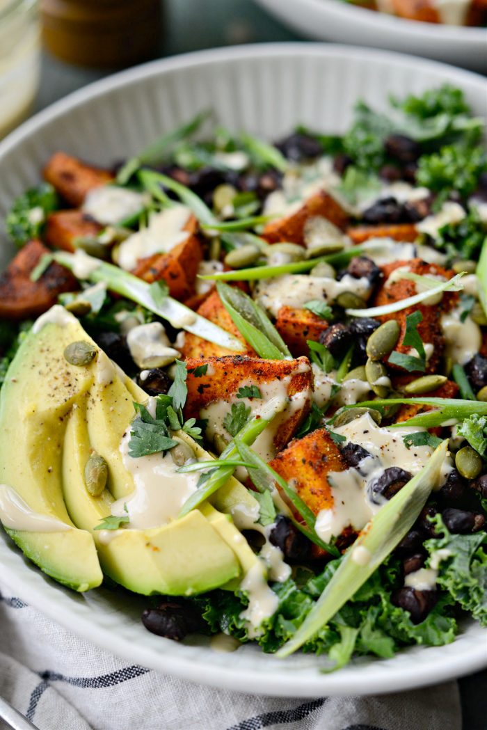 What I love most? Besides the slightly crispy black beans and creamy avocado – it’s how the dressing mingles with the seasoning on the roasted sweet potatoes and creates a flavor bomb for your tastebuds. But honestly the whole salad is amazing.