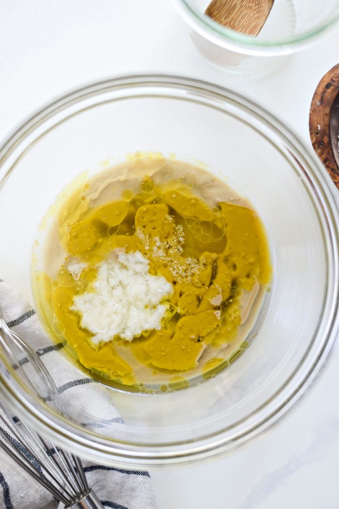 In a medium bowl measure and add in 3 tablespoons tahini, 1 clove grated fresh garlic, 2 tablespoons lemon juice, 1 tablespoon olive oil and 1 teaspoon honey. You can control how garlicky this dressing is by using a smaller clove of garlic (for less) and a larger clove for more garlic flavor.