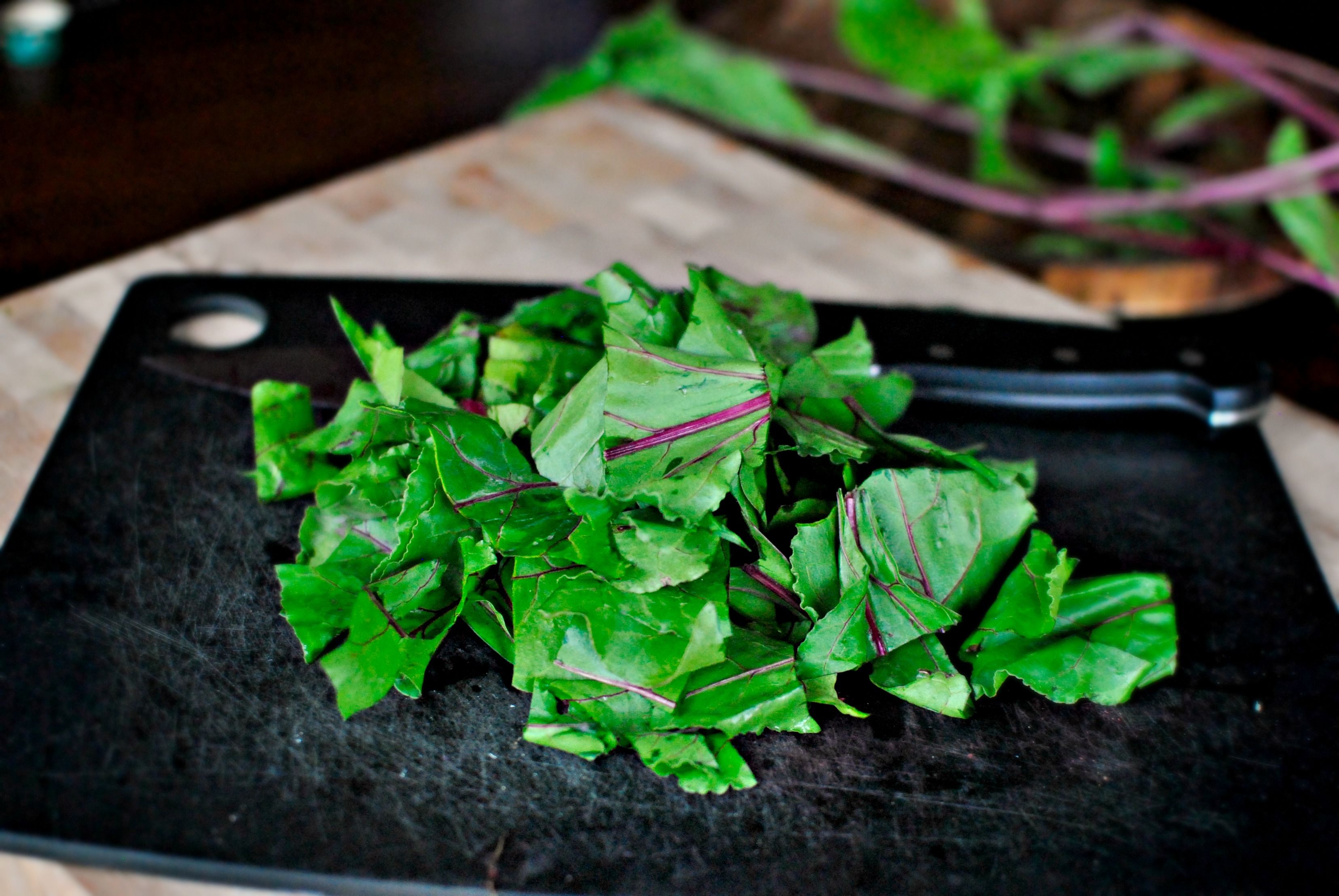 Meanwhile, remember those beet greens? Give those a rinse and pat dry. Then roughly chop, doesn’t have to be perfect.