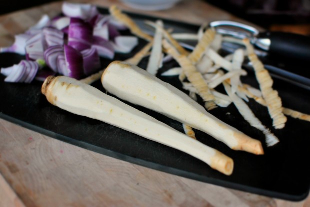 Trim off the roots but keep the leafy green tops, just off to the side because we’ll be using those a little later.