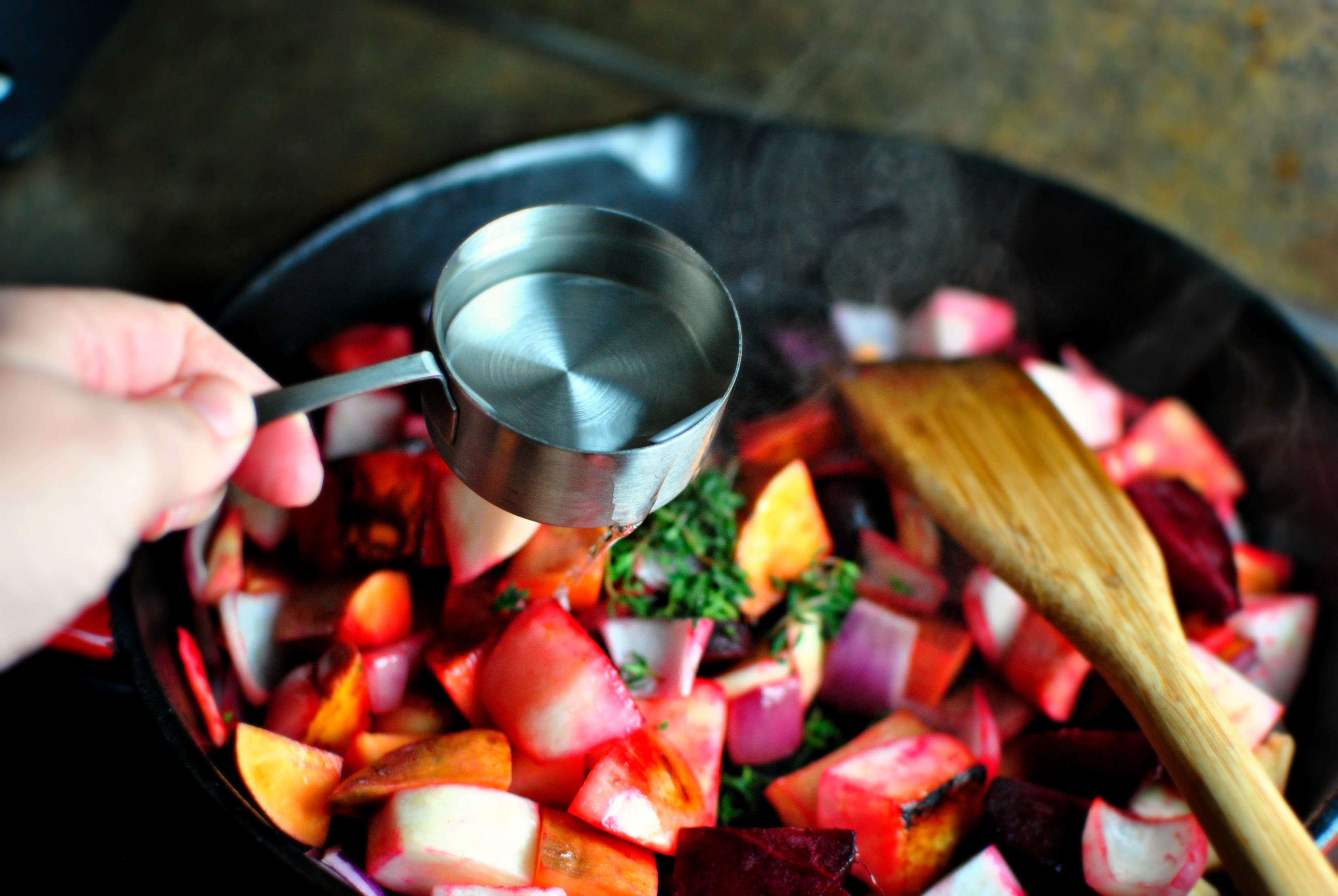 In this simple and rustic hash the root-stars of the show are carrots, parsnips, turnips and beets. All of those are cooked up in a skillet with garlic, red onion, thyme, some s & p and a little olive oil until everything is nice and buttery soft and tender. It’s all so ridiculously simple.