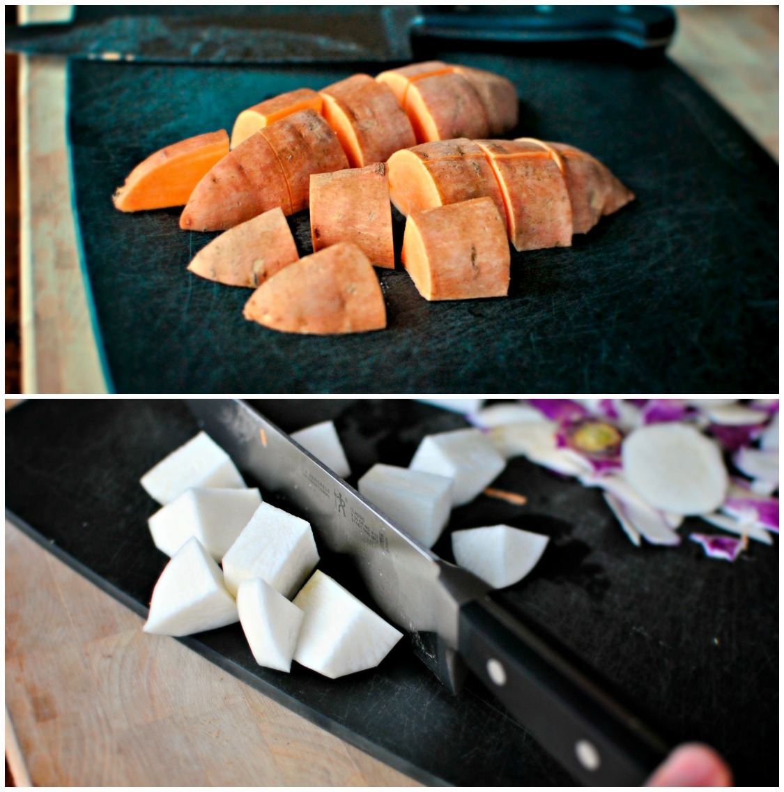 First, start by cubing up a sweet potato. I personally like to leave the skin on because there is so much vitamins and minerals in the skin. For the turnips, these I peel and cube as well.
