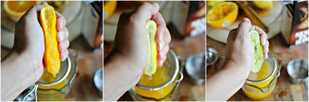Squeeze (and strain) a 1/4 cup of fresh squeezed orange juice e. Then squeeze the juice from an entire lemon and lime.