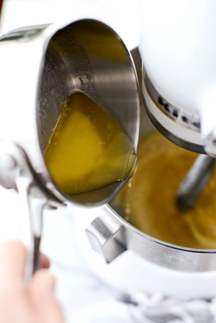 Then pour in 1/4 cup melted (and cooled) butter and mix to combine. If the butter is hot, it will immediately scramble the eggs. You definitely don’t want that.