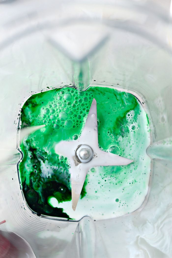 Into your blender add 1 teaspoon mint extract, a splash of vanilla extract and 3/4 teaspoon green food coloring. You don’t need to add the food coloring if you don’t want to. Typically I don’t like to use food coloring when I bake (unless it’s red or black velvet). But like those were, these also are a special occasion, therefore an exception to my rule.