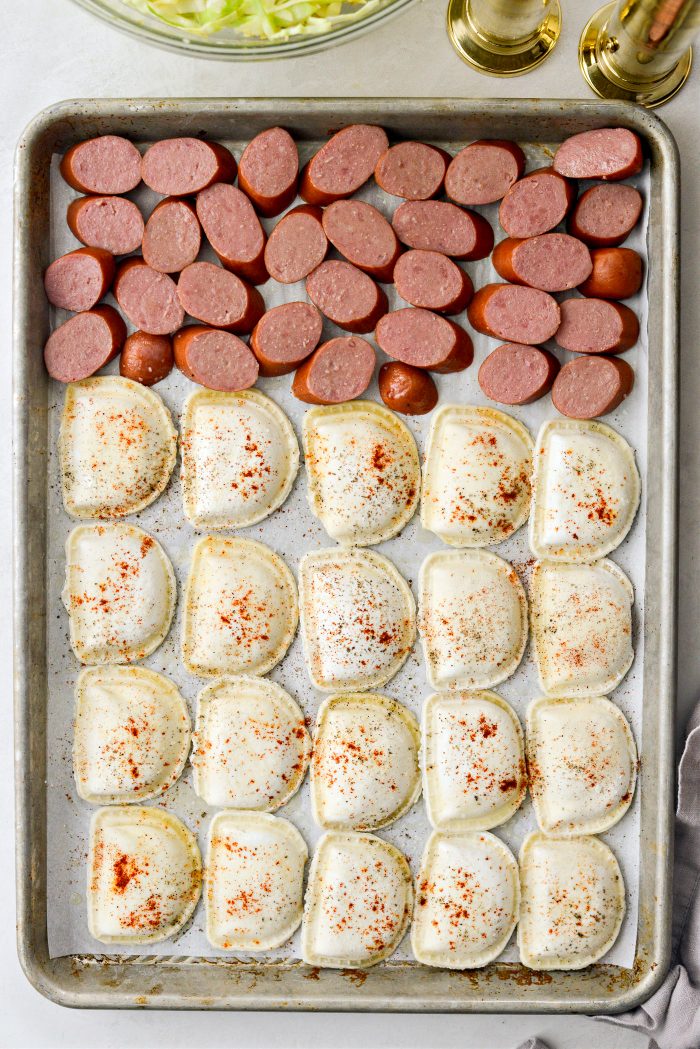 - On the prepped larger pan, arrange sliced kielbasa and frozen pierogies. Spray the pierogies with olive oil spray and season with kosher salt, freshly ground black pepper and paprika.