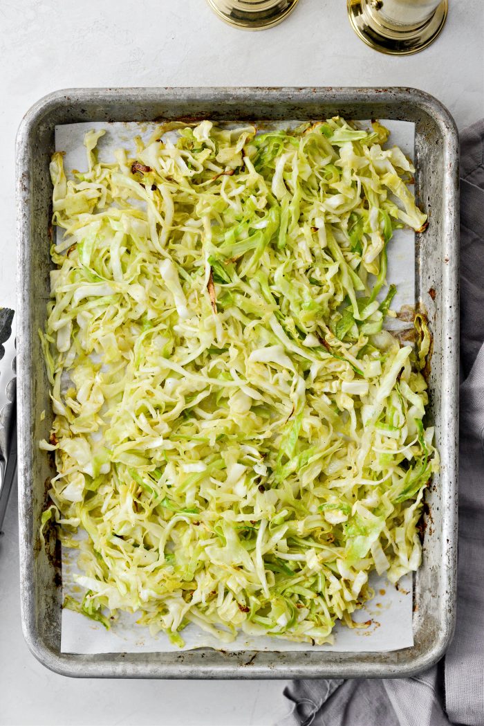 On the smaller prepared pan, add all of the cabbage and arrange in a single layer. Slide both pans into your preheated oven and bake on separate racks for 15 minutes.