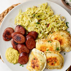 Sheet Pan Pierogies and Kielbasa (with Cabbage) is a super simple and comforting meal for any night of the week. Crispy pierogies and smoky kielbasa is served with flavorful and tender cabbage. Yields 4 servings.