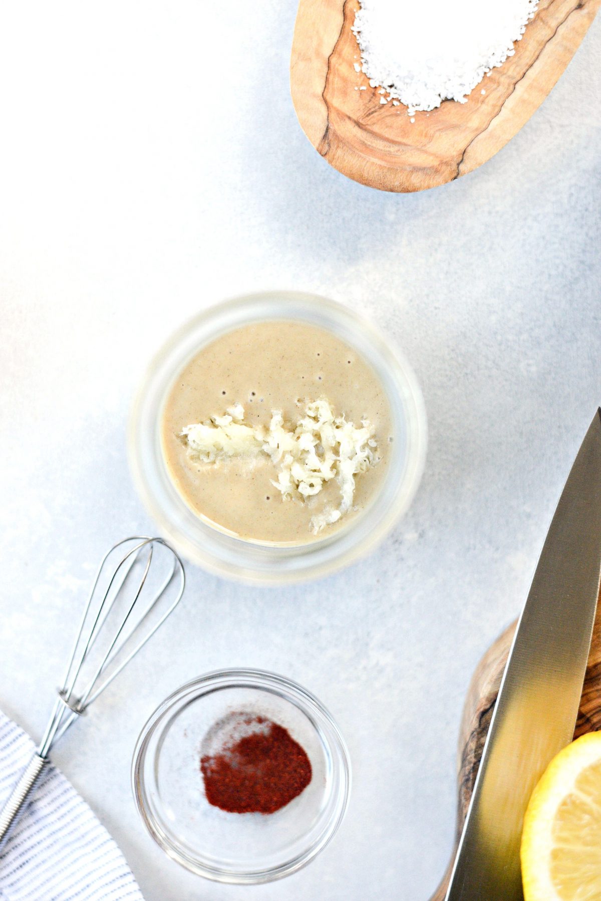 - In a small bowl or glass jar, whisk together the tahini, garlic, paprika, lemon juice, olive oil and salt.