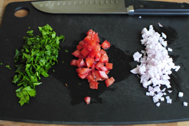 Roughly chop the parsley, you’ll need about 2 tablespoons. Then remove the seed from 1/2 a roma tomato and dice it up small. Do the same with 1 small shallot