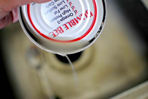 Drain a 12 oz. can of tuna. Albacore, in water is preferred.