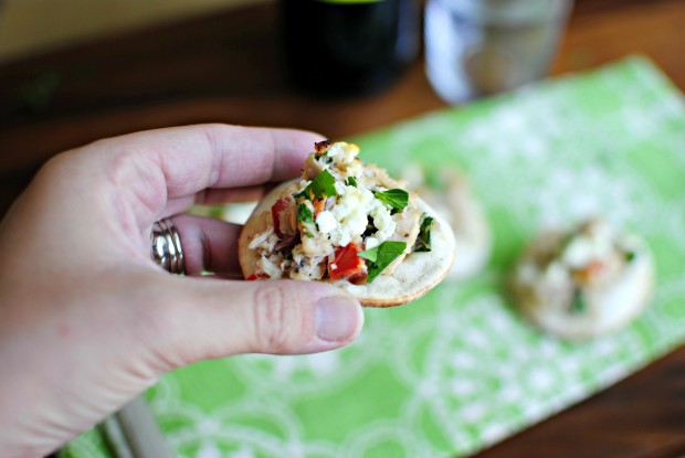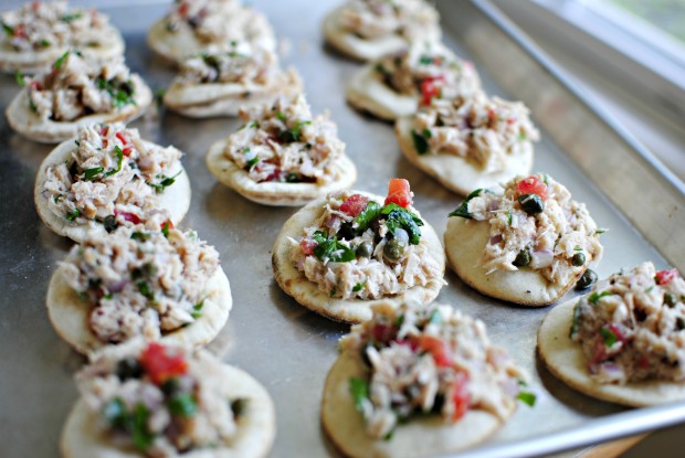 These mini tuna melts are loaded with flavor and not the calories! Tuna is tossed with tomatoes, capers, shallots and a simple red wine vinaigrette.