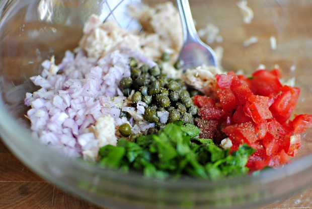 And add the capers along with the shallots, parsley and tomatoes in with the broken up tuna fish.