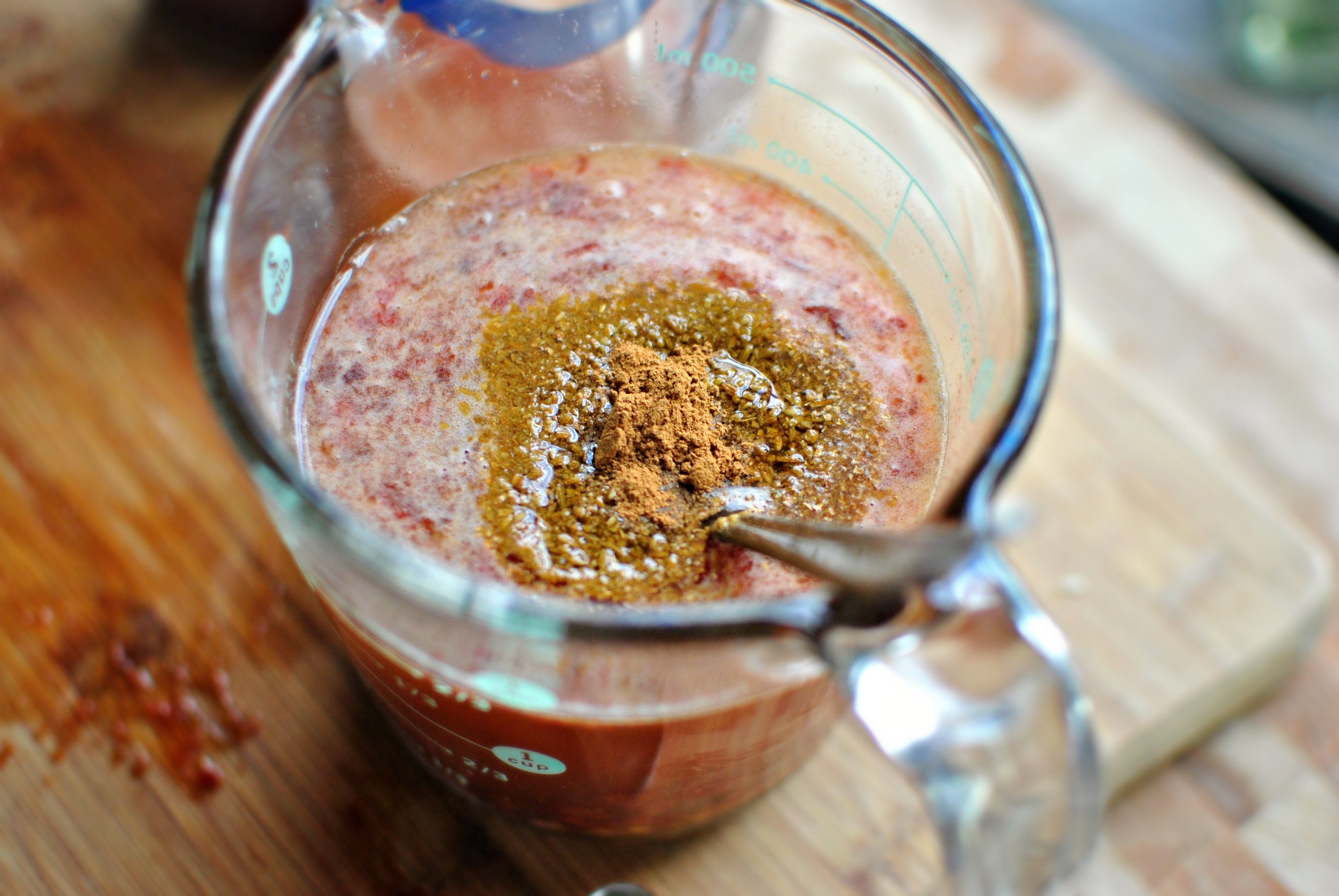 - Measure out the cup of chicken broth and to it add the minced chipotles, cumin, coriander, cinnamon, 1/4 cup of apple cider vinegar, two tablespoons of honey and the cooked onions and garlic. Stir to combine.