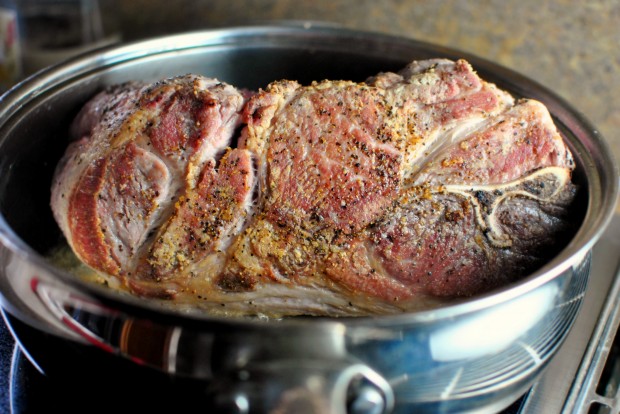 Generously season it with copious amounts of kosher salt and coarse black pepper. It’s a big hunk of meat so you don’t have to go easy on either one.