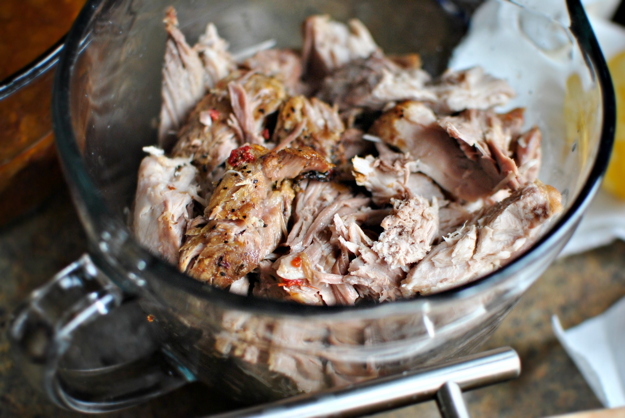 I cut the slow cooker chipotle honey pulled pork into larger chunks and then used two forks to shred it up. Sneak a couple bites… you know you want to!