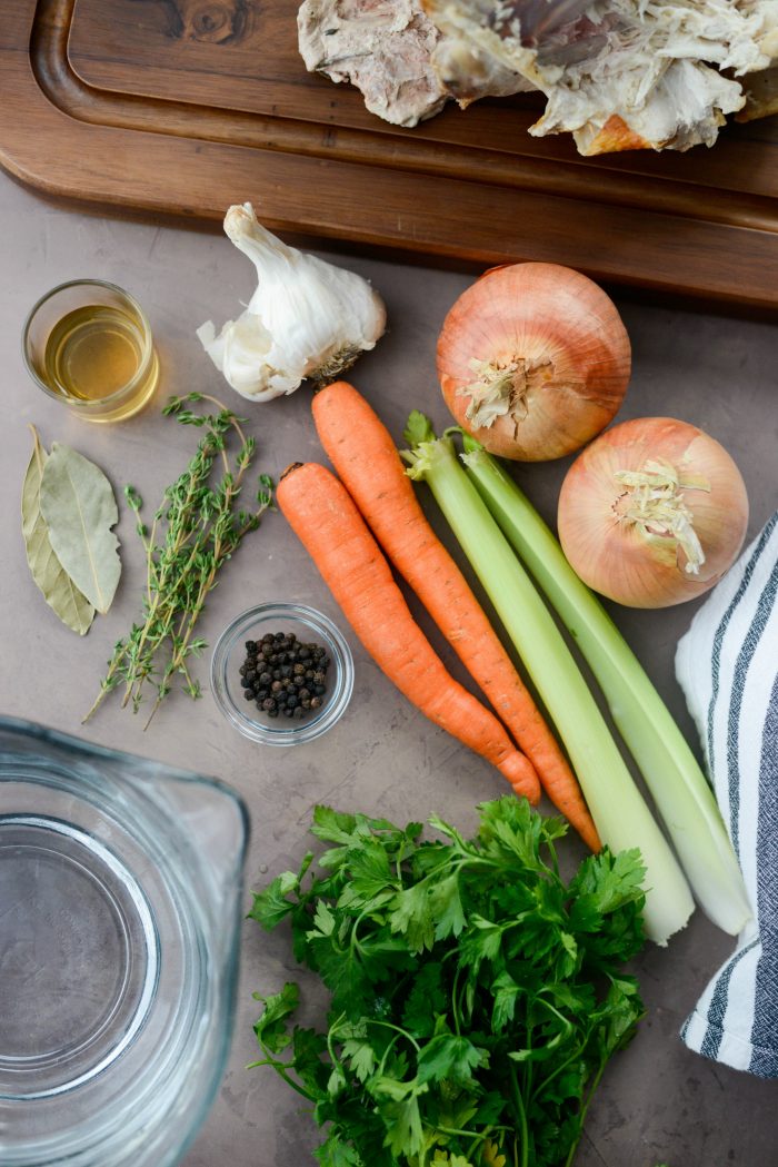 - Add the bones along with the unpeeled onions, carrots, celery and garlic (with skins), parsley, thyme, bay leaves, peppercorns, vinegar and water.