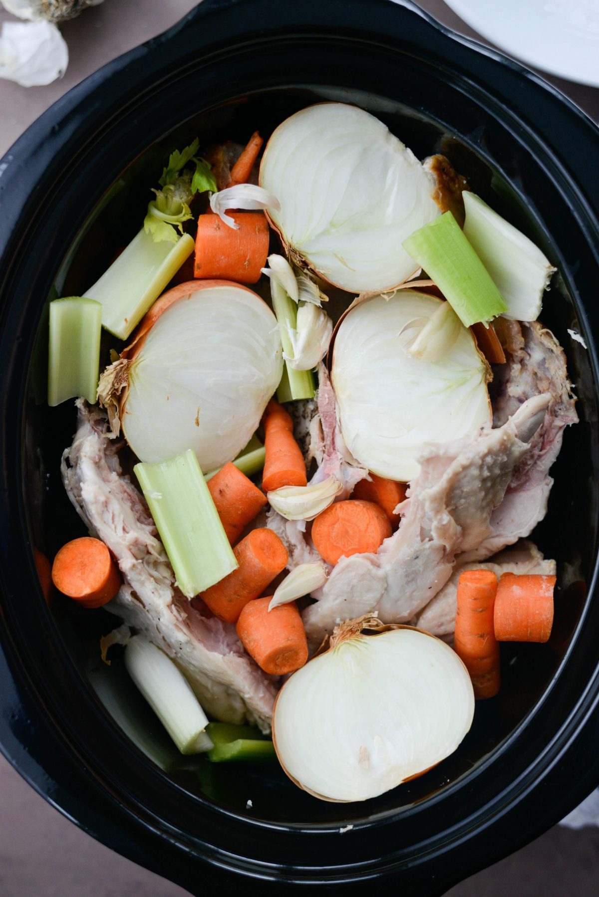 - Break down the turkey carcass to fit into your slow cooker.