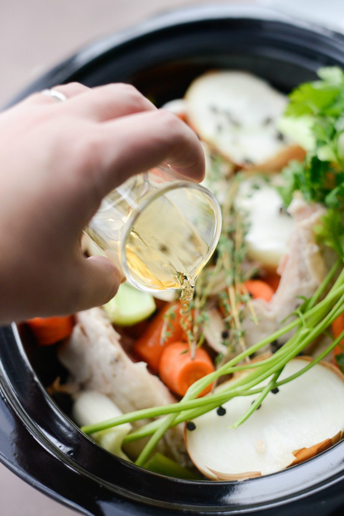 Add in 6 sprigs fresh parsley, 4 sprigs fresh thyme, 2 bay leaves and then 1 tablespoon of black peppercorns.