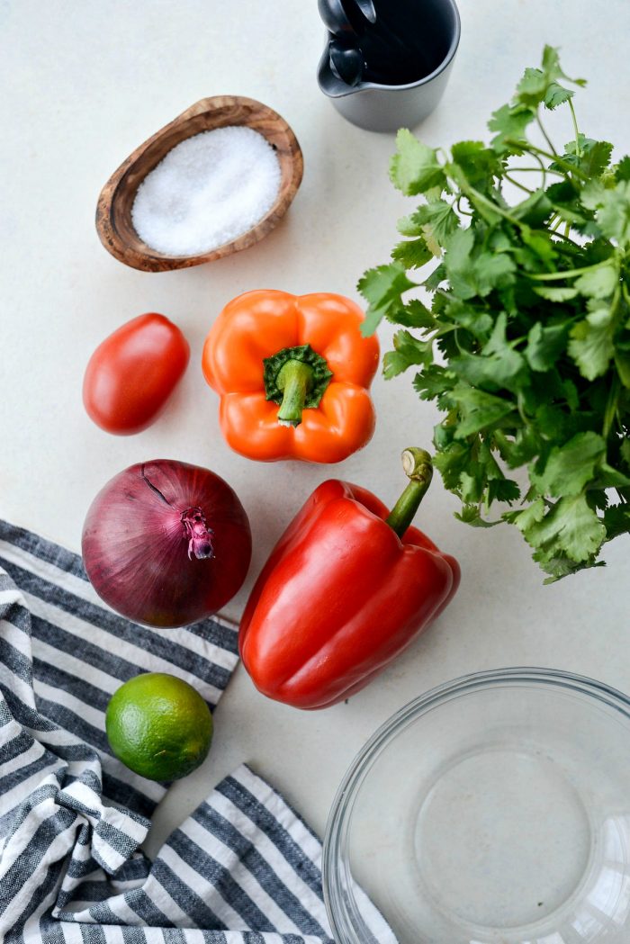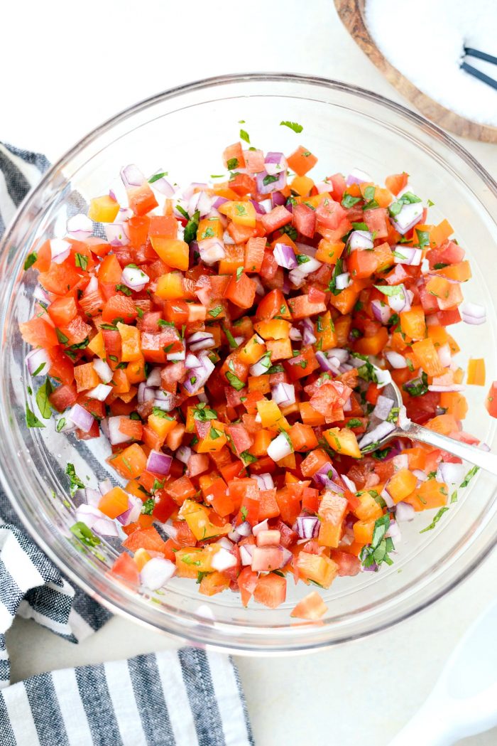 - Add the tomato, peppers, red onion, cilantro, salt and lime juice into the bowl. Add minced jalapeño for some heat.