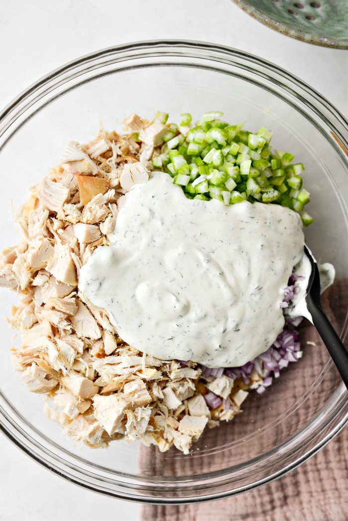 - In a large mixing bowl, add the chickpeas. Using a potato masher, smash the chickpeas until crumbly. To that, add the chicken, celery, red onion and all of the dressing. Toss well to combine.