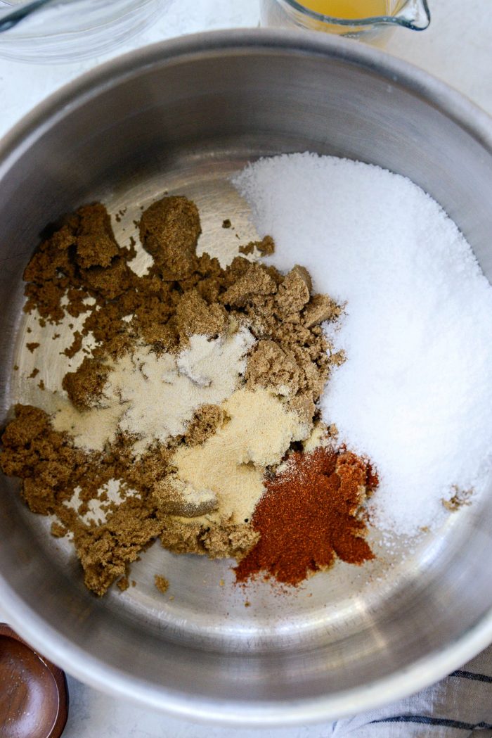 In a large stock pot, measure and add; 1 cup plus 2 tablespoons kosher salt, 1 cup dark brown sugar, 1/2 cup apple cider vinegar, 1 tablespoon garlic powder, 1 tablespoon onion powder and 1 tablespoon cayenne pepper.