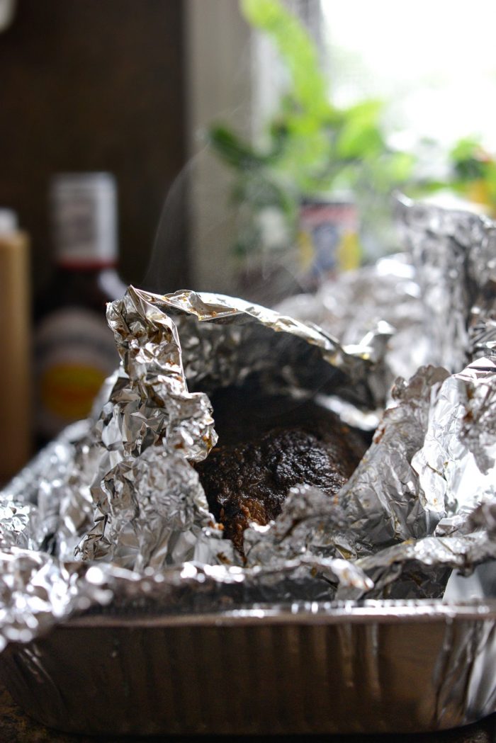 DOUBLE WRAP! Wrap the pork a second time in the heavy duty foil to ensure the pork from taking on any more smoke.