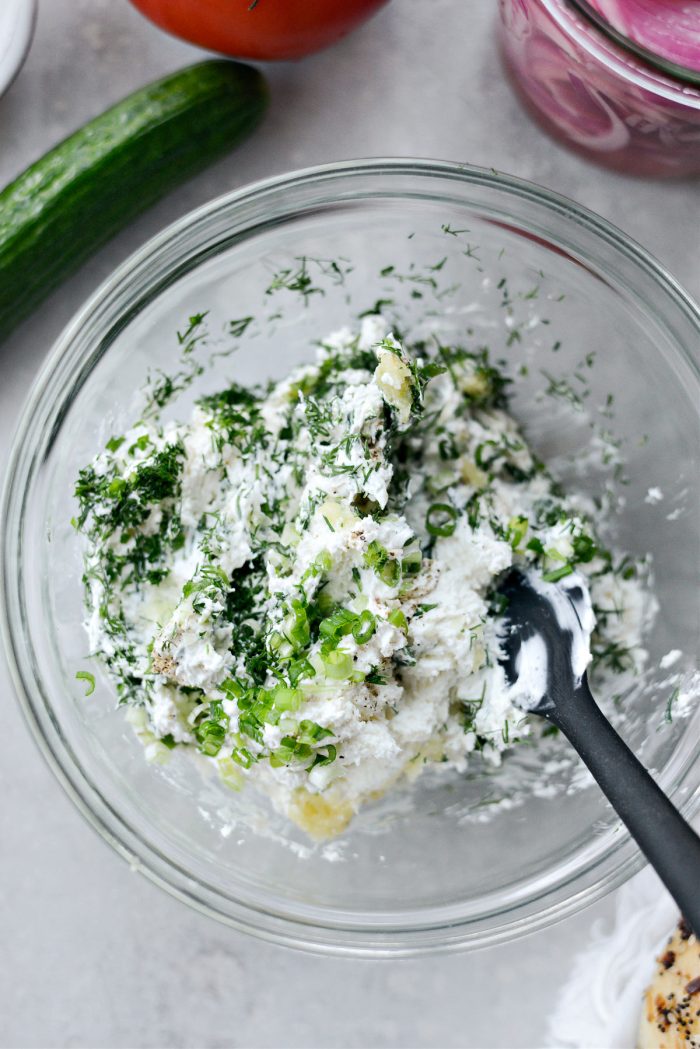 - Slice and toast your bagel. Swipe 2 generous tablespoons of the garlic dill cream cheese on both of the toasted sides.