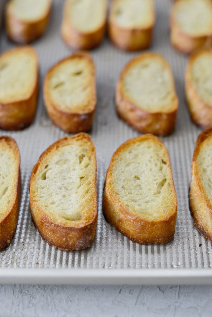 - Place sliced baguette on prepared baking sheet, spray or drizzle with olive oil. Bake 10 minutes or until golden.