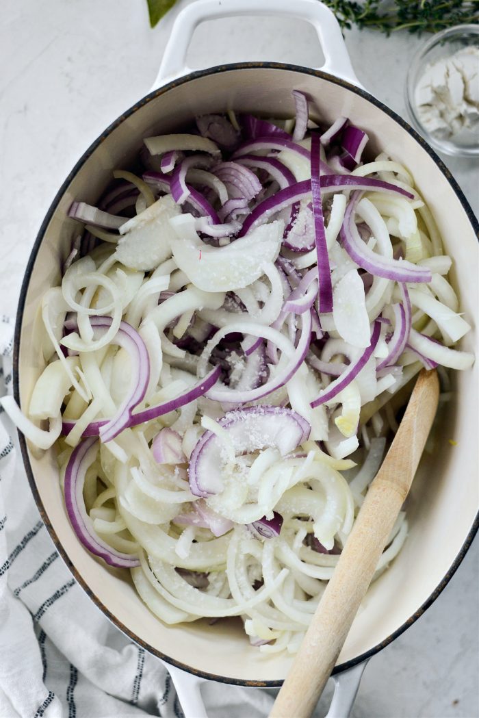 Start by slicing up 3 pounds of onions about 1/4 of an inch thick. I’m using a combination of sweet, yellow and red onions plus shallots. You can use all red or a mixture of whatever you have on hand. The types of onions my affect the taste slightly but should be delicious nonetheless.