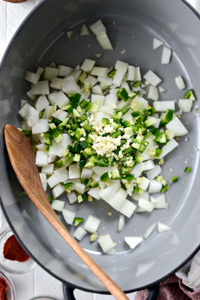 - In a large dutch oven, add 1 tablespoon olive oil, onions, jalapeno and garlic with a small pinch of kosher salt.