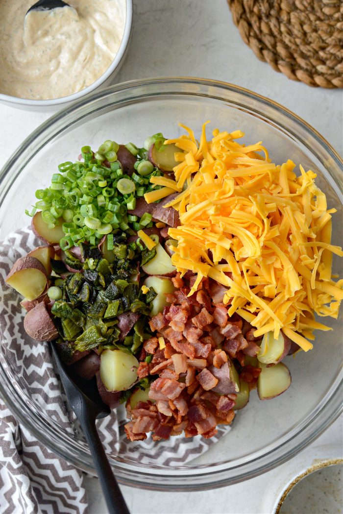- In a large bowl, add the quartered potatoes, poblano, bacon, green onions and cheddar cheese. Pour in the dressing and use a rubber spatula to mix until thoroughly combined.