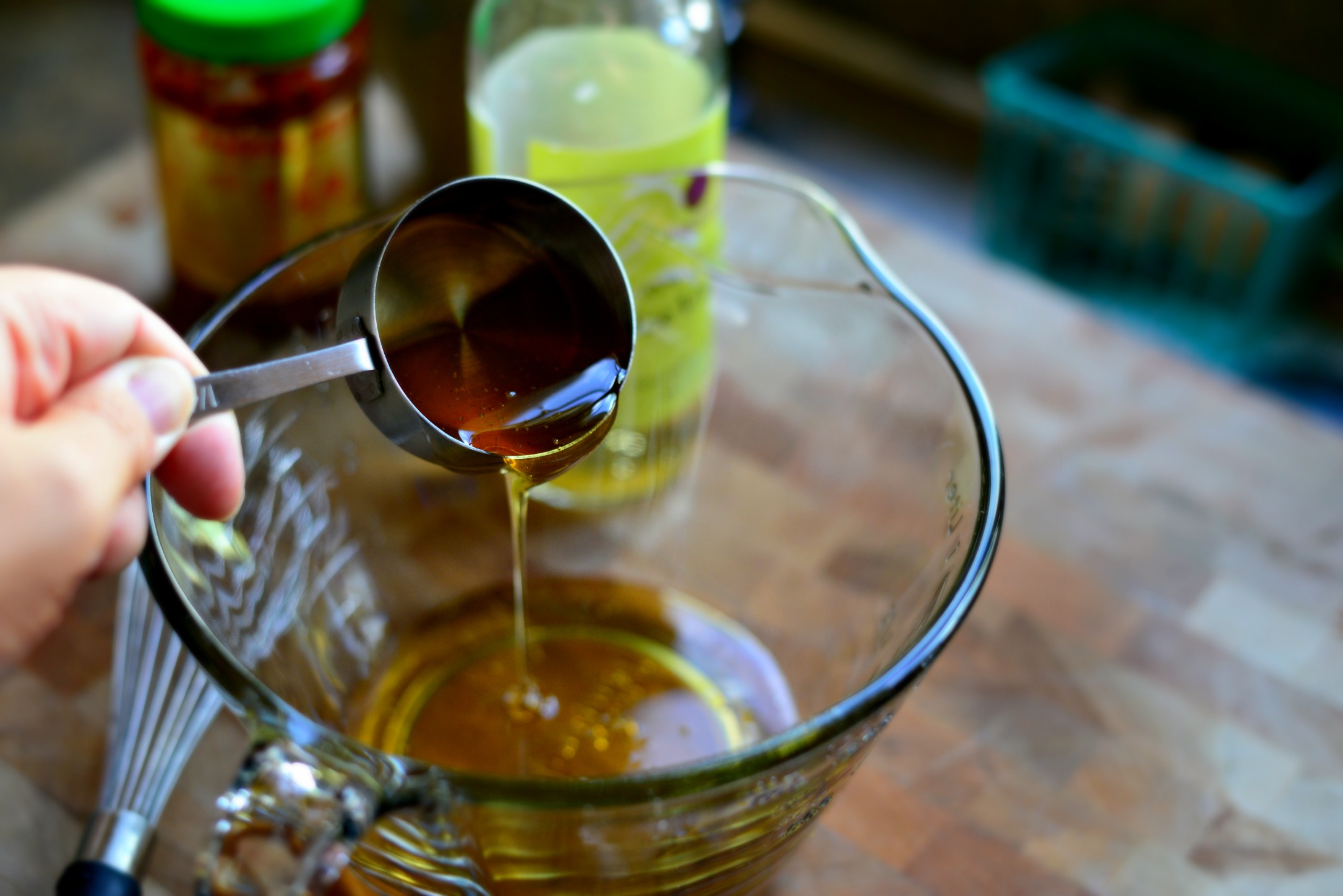 First make the sauce. In a measuring cup or bowl; add 1/4 cup plus two tablespoons honey. Good honey. Yes, there’s such a thing as bad honey. Trust me. Once Pat went to some little mini-store on his way home from work to pick me up a bottle and let me just tell you, there is no way that was honey. I mean it looked like watered down honey, barely yellow. Gross.