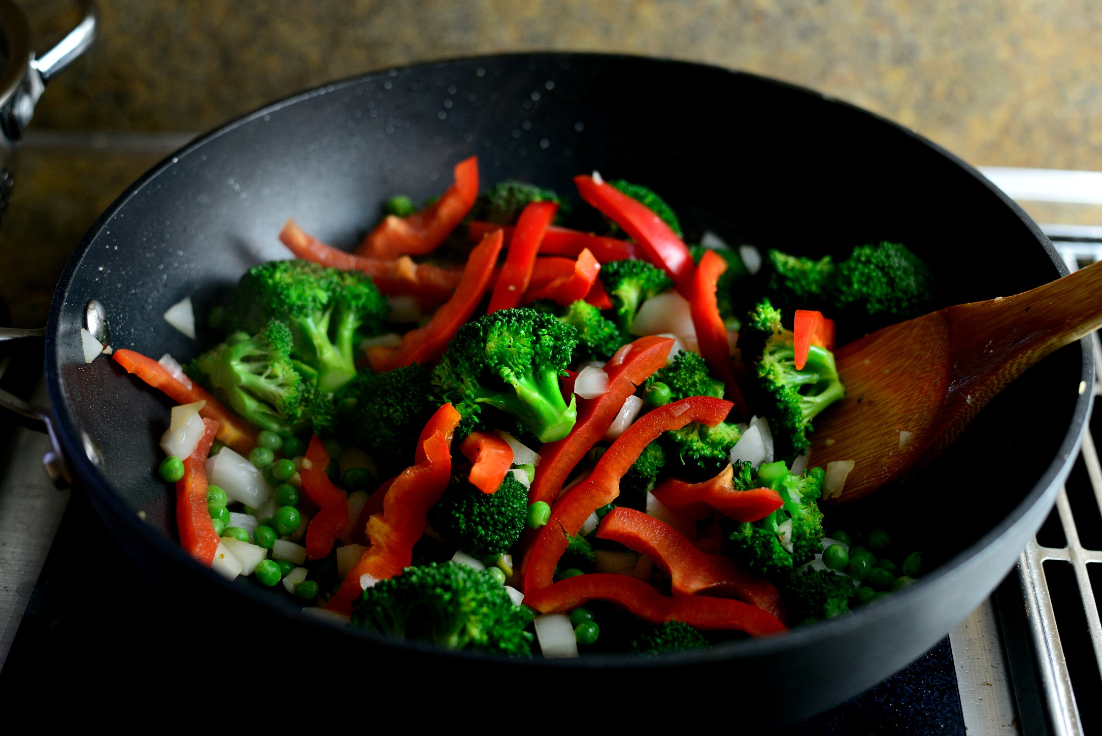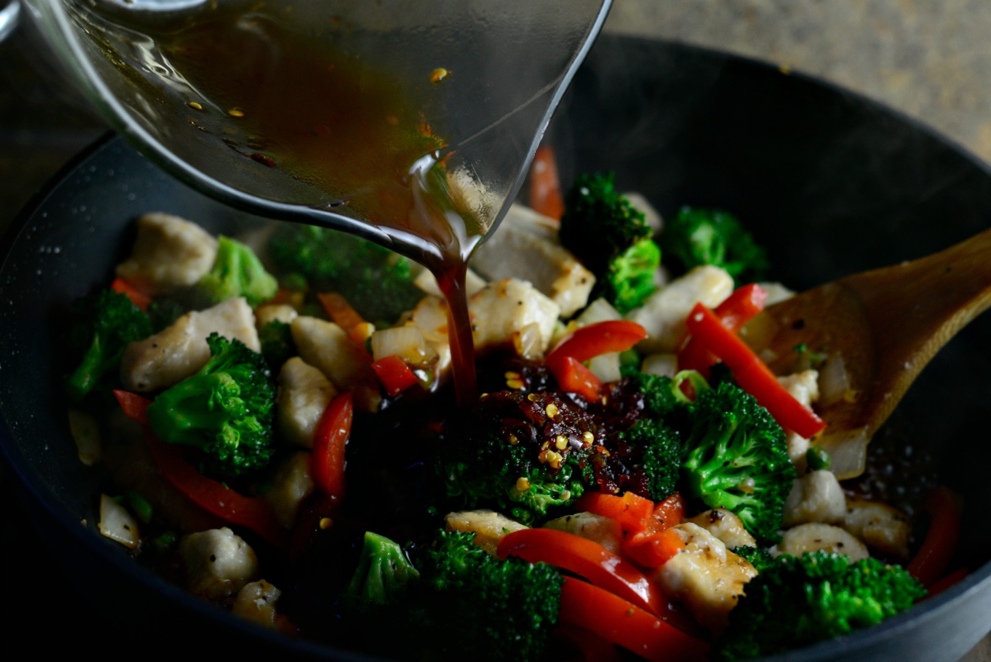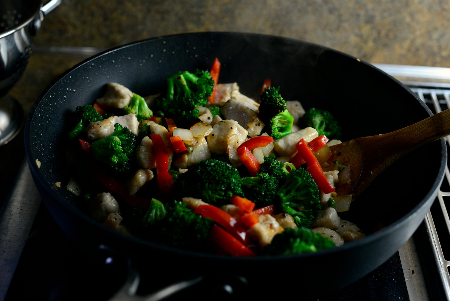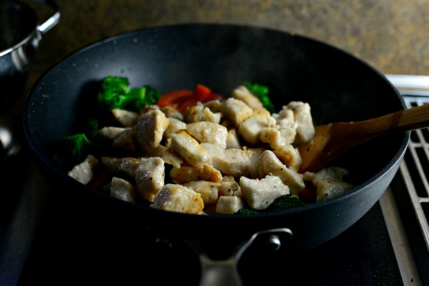 - Add the broccoli, peppers, onion and garlic to the wok. Cook, stirring often until vegetables are tender yet still a bit firm. Add chicken back in and cook for 2 to 4 minutes or until fully cooked.