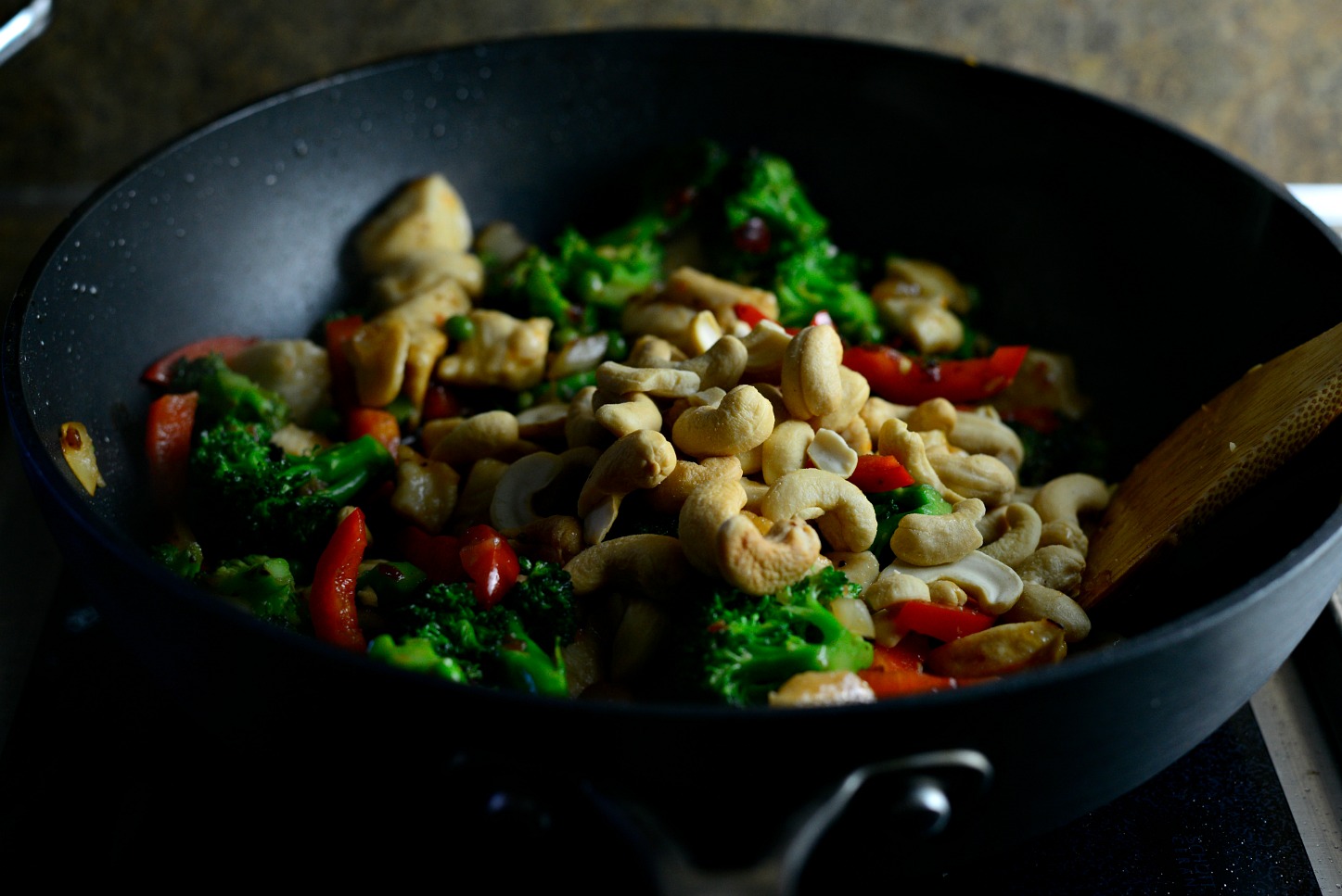 - Add cashews, peas and sauce to the wok. Stir until coated and heated through.