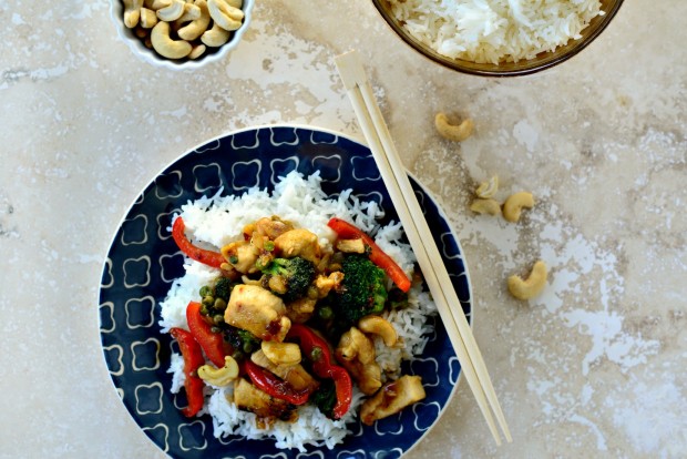 Serve the cashew chicken stir-fry with rice or noodles and dinner is done.