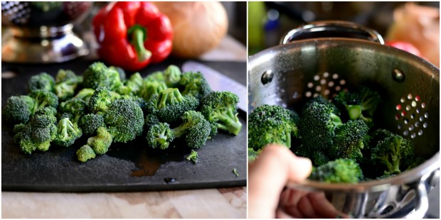 Trim off about two cups or one small bunch of broccoli florets. Then give them a quick rinse and set next to your stove top.
