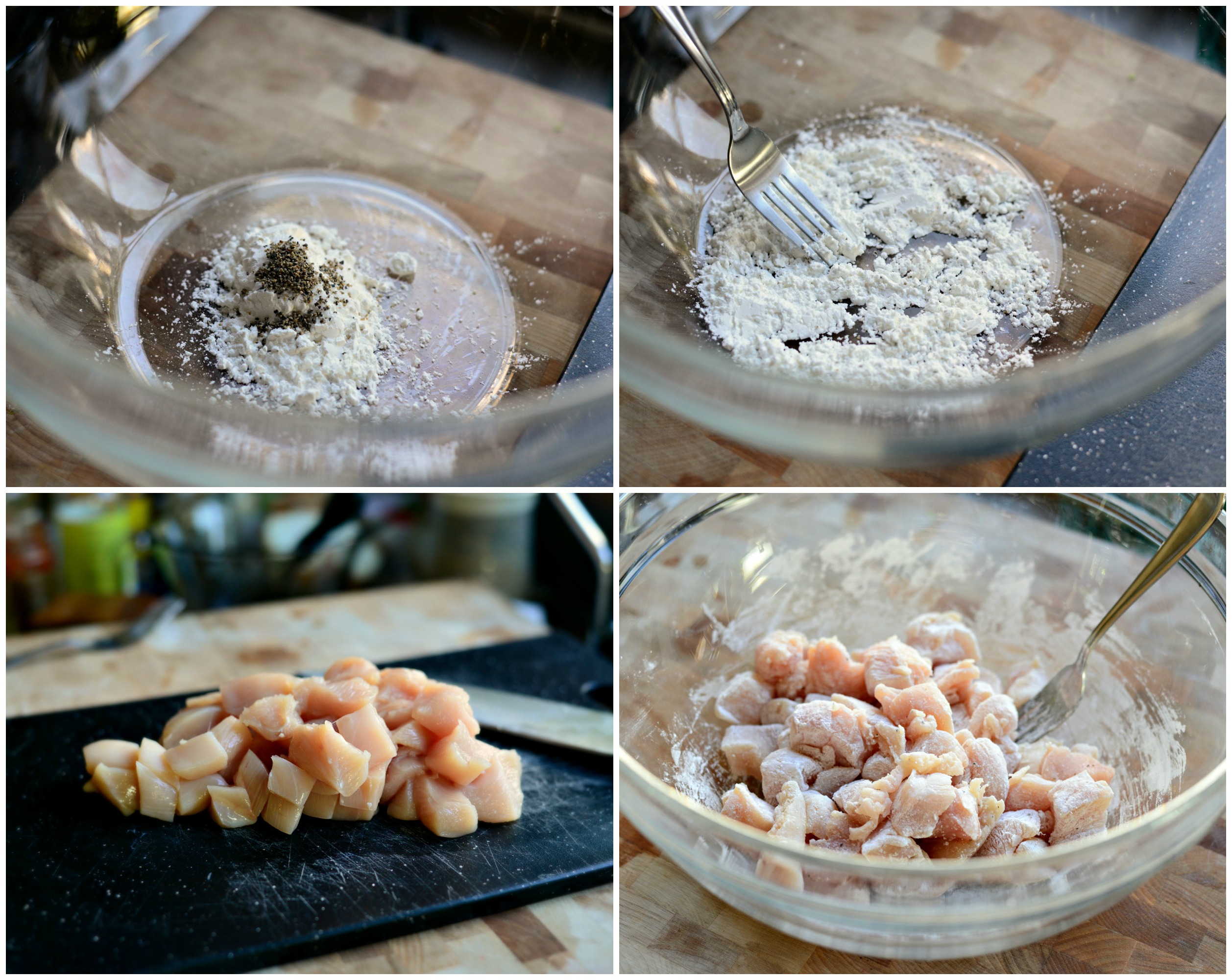 Then In a large bowl add two tablespoons of cornstarch, 1/2 teaspoon kosher salt and 1/4 teaspoon coarsely ground black pepper. Next throw in two cubed chicken breasts (about 1-1/4 pounds) and then toss it around to coat in the seasoned starch.