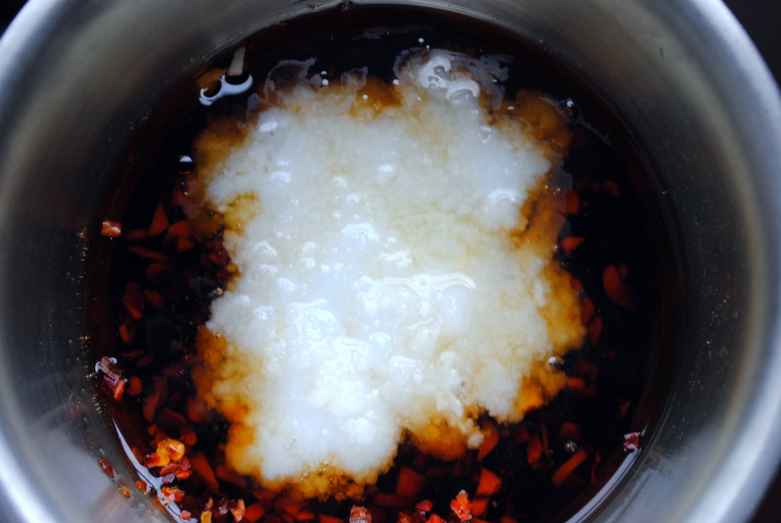 - To make the sauce, start by adding minced garlic, pepper flakes, sugar, soy sauce, vinegar, sesame oil and coconut oil to a small bowl, whisk until all ingredients are combined.