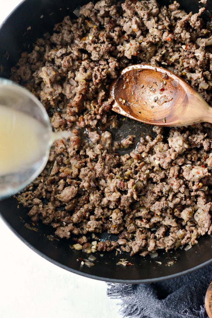 - Remove the casings from the italian sausage and add it into the skillet along with the beef. Use a wooden spoon to break it up into small crumbles. Stir occasionally until no longer pink. Increase the heat to medium-high and cook until browned and crispy bits form on the bottom of the pan.