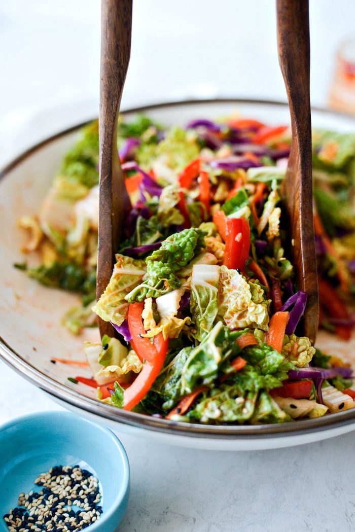 In a large bowl, add the sliced Napa cabbage (about 4 cups), 1 cup sliced purple cabbage, 2 medium carrots – shaved, 1 small red bell pepper (sliced), 1/3 cup sliced green onions (about 3 to 4).