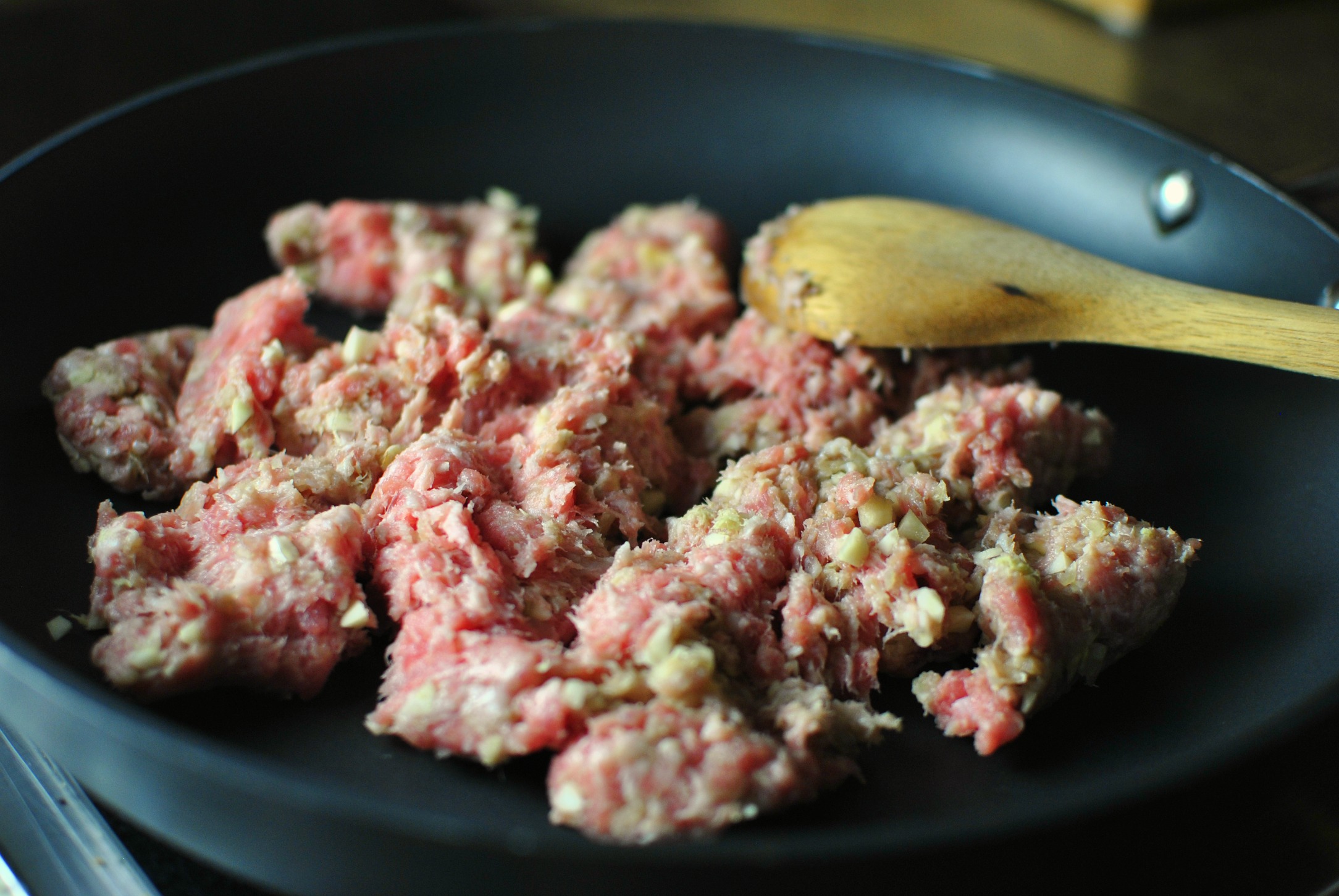 - Preheat a large non-stick skillet over medium-high heat. Once hot, add in the pork and spread it out, do not stir so the pork can get a golden crust on the bottom. Turn then break up any large clumps and continue to cook thoroughly.